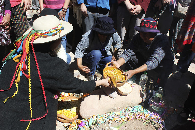 El otro momento más importante del mundo andino, porque la Pachamama no está aislada, está inserta en la época de la abundancia, lo que hoy se ha visibilizado como el qhapaq raymi, la época de la abundancia. Entonces, a la Pachamama la transitamos todo el tiempo, nada más que el ciclo se inicia con el ritual de darle de comer a la Pachamama. Le decimos dar de comer porque la Pachamama es un ser vivo en la visión de los pueblos andinos, no es algo ajeno a nosotros, no es la ecología, no es el medioambiente. Hay una forma de pensar en lo andino que es la crianza recíproca: yo crío mis animales, me crío junto a ellos, junto a un montón de vicisitudes, aventuras y desventuras que tengo en ese tiempo mientras voy criando los animales, mientras voy sembrando; cuando cosecho, cuando comparto esa comida, cuando guardo maíz para la Pachamama del año siguiente, entonces hay una convivencia continúa con el territorio.