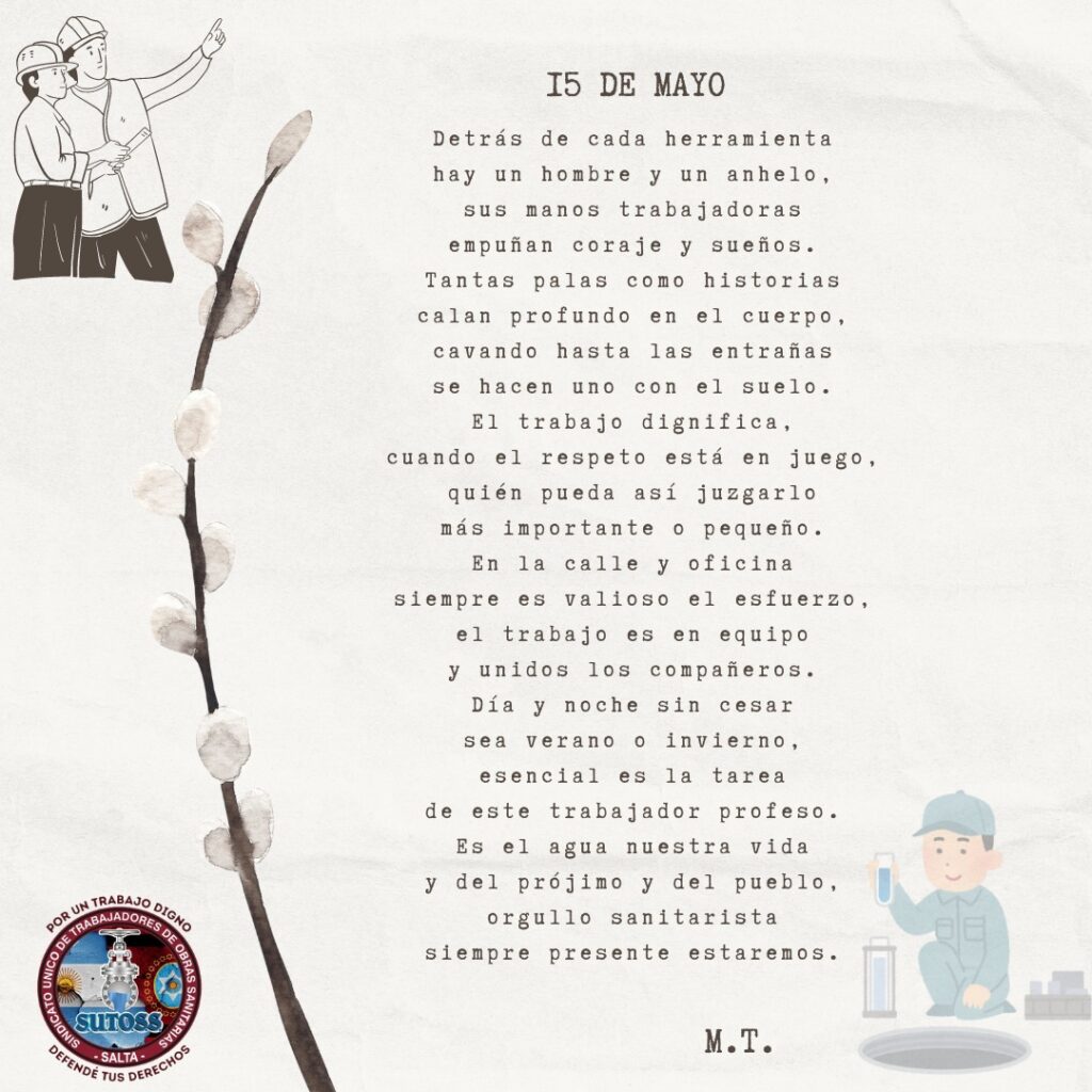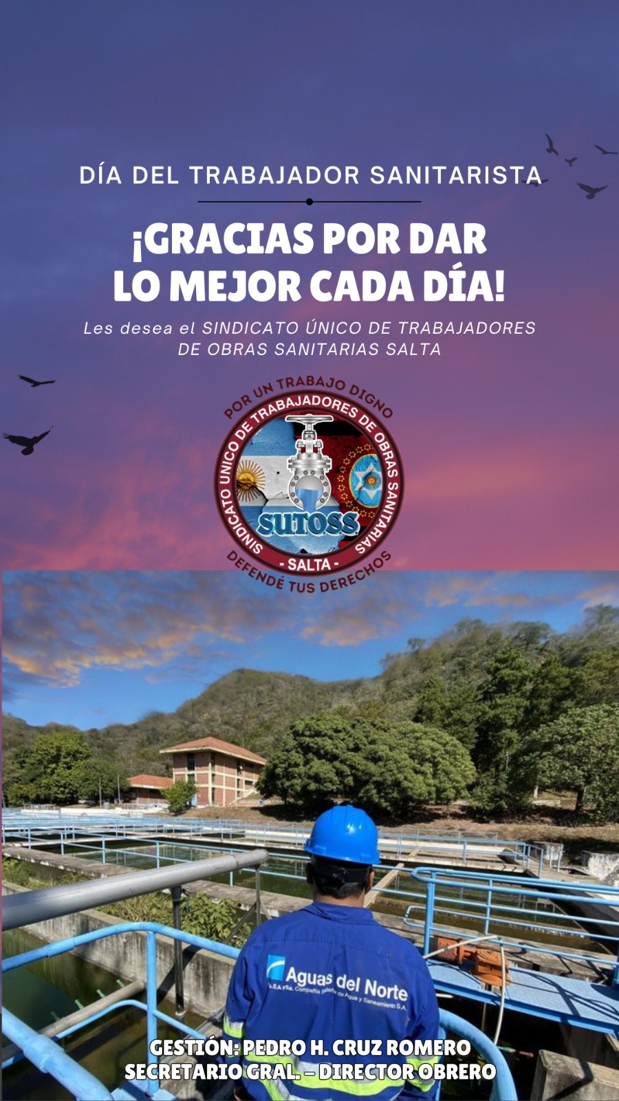 DESDE EL SINDICATO ÚNICO DE TRABAJADORES DE OBRAS SANITARIAS SALTA, se reconoce y homenajea la labor de todos los COMPAÑEROS Y COMPAÑERAS que se desempeñan, dedicando su vida a cuidar y proteger la salud de la población, sabemos del esfuerzo y los desafíos constantes para otorgar el servicio esencial de agua potable a los salteños, han demostrado un compromiso inquebrantable, la dedicación, el profesionalismo y la vocación de servicio son ejemplos de valentía y solidaridad que merecen ser reconocidos y valorados.