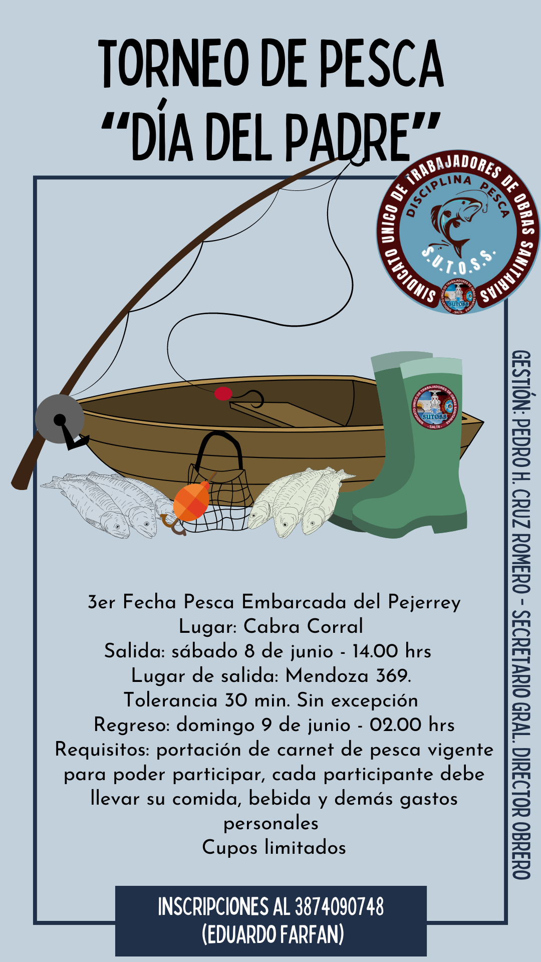 La jornada de Pesca se realizará el día 8 de Junio en el Dique Cabra Corral. Saldremos desde calle Mendoza 369 a las 14 horas, se ruega puntualidad!! ya que sólo tendremos media hora de tolerancia. El regreso será el día Domingo aproximadamente a las 2 de la madrugada.