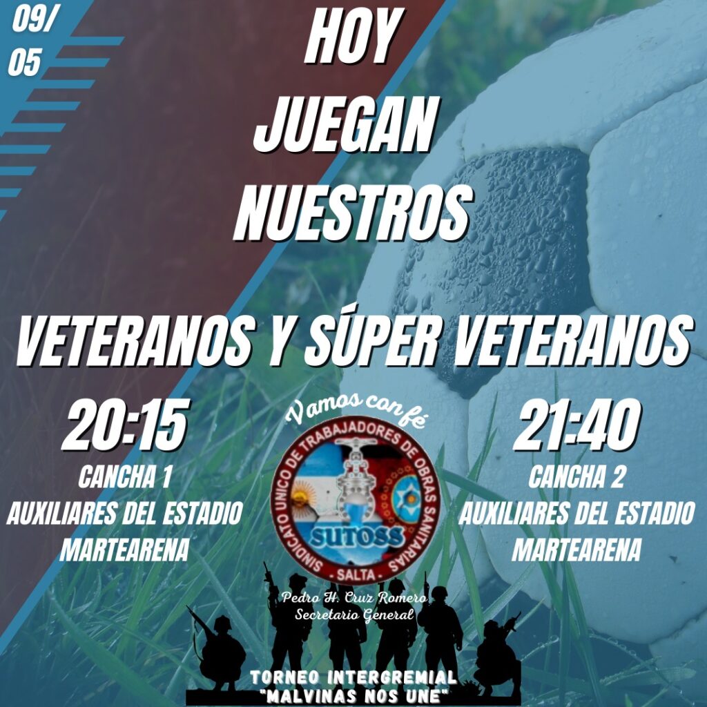 Los equipos titulares del SUTOSS, categoría Veteranos y Súper Veteranos, siguen hoy su paso por el Torneo intergremial de fútbol «Malvinas nos Une» en las canchas auxiliares del Estadio Martearena, donde se medirán con el gremio de Bancarios.