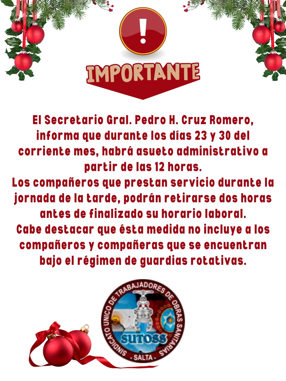 El Secretario Gral. Pedro H. Cruz Romero, informa que durante los días 23 y 30 del corriente mes, habrá asueto administrativo a partir de las 12 horas.