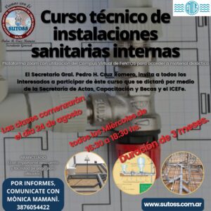 Nuestro SUTOSS, a través de la FENTOS, ofrece a sus afiliados una nueva capacitación sobre instalaciones sanitarias internas. El mismo se dictará a partir del