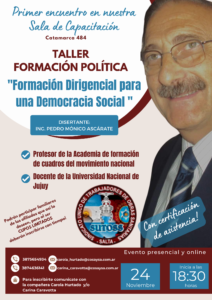El 24 de Noviembre a las 18 horas en la sala de capacitación de calle Catamarca 484, se llevará adelante un taller de formación política,