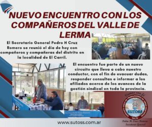 El Secretario Gral. Pedro H. Cruz Romero, durante ésta semana, pudo visitar a los compañeros de Valle de Lerma, Cafayate, Metán y Rosario de Lerma,
