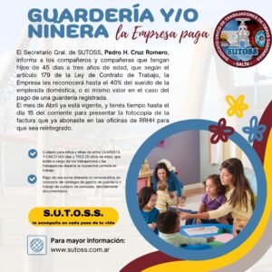 El Secretario Gral. de S.U.T.O.S.S. y Director Obrero de Co.S.AySa, PEDRO H. CRUZ ROMERO, informa a todos los compañeros y compañeras que tienen hijos a