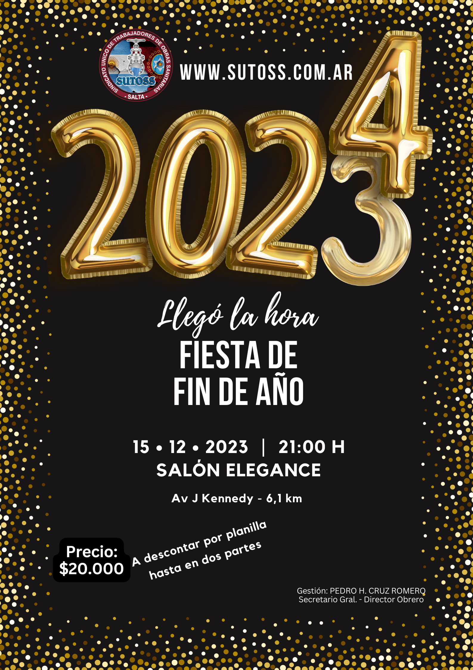 Ya no falta nada!!! El 2023 ya se despide, y muchas personas aprovechan esta época del año para reflexionar sobre lo vivido, agradecer y evaluar lo aprendido. Es un momento en el que se realizan balances sobre el pasado. La ilusión es común en estos días. Con el cambio de año, muchos deciden dejar atrás aquellas cosas que ya no les representan y se prometen nuevos desafíos. Y desde el SINDICATO ÚNICO DE TRABAJADORES DE OBRAS SANITARIAS SALTA queremos levantar las copas y brindar con cada uno de ustedes, por eso ya estamos trabajando en los preparativos de las CENAS DE FIN DE AÑO de la familia sanitarista.