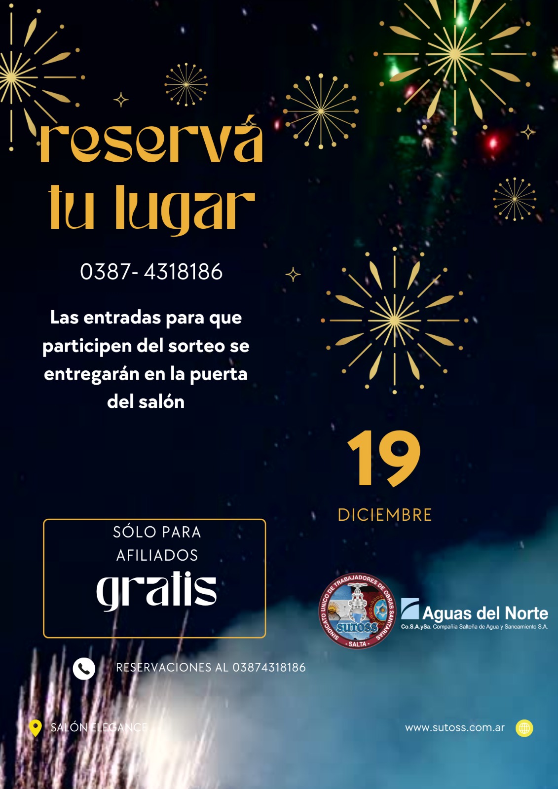 Por primera vez, y tras un gran esfuerzo por parte del SINDICATO ÚNICO DE TRABAJADORES DE OBRAS SANITARIAS SALTA, y la Empresa AGUAS DEL NORTE, la Cena de Fin de Año será gratuita para los afiliados!!!