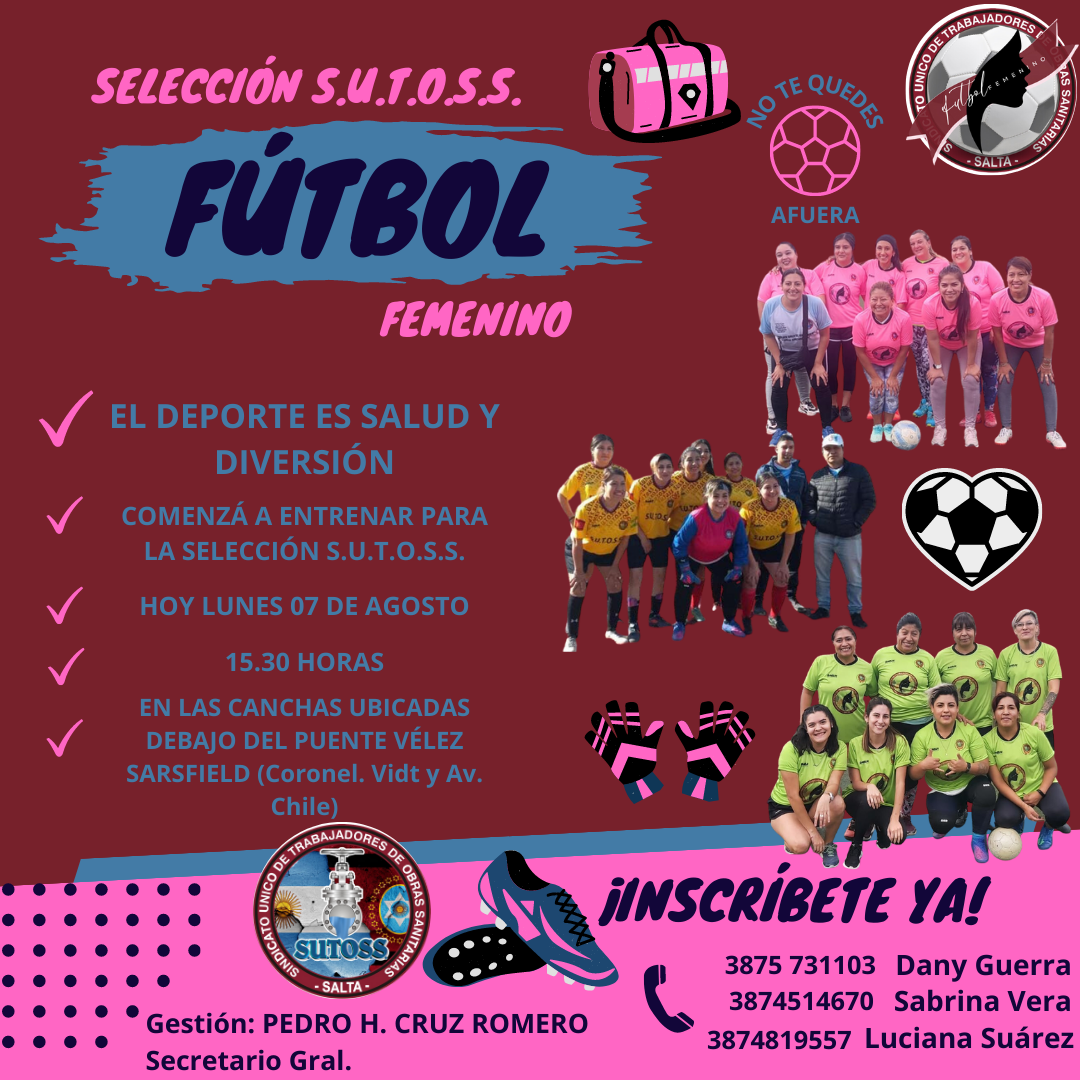 En el día de la fecha, Lunes 07 de Agosto, a partir de las 15.30 horas, están todas invitadas a participar de los entrenamientos de fútbol femenino para el SELECCIONADO SUTOSS.