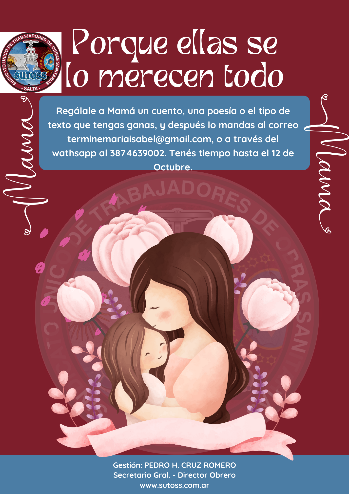Desde el SINDICATO ÚNICO DE TRABAJADORES DE OBRAS SANITARIAS SALTA invitamos a participar a todos los compañeros y compañeras que deseen mimar a mamá en su día a través de la narrativa o la lírica.