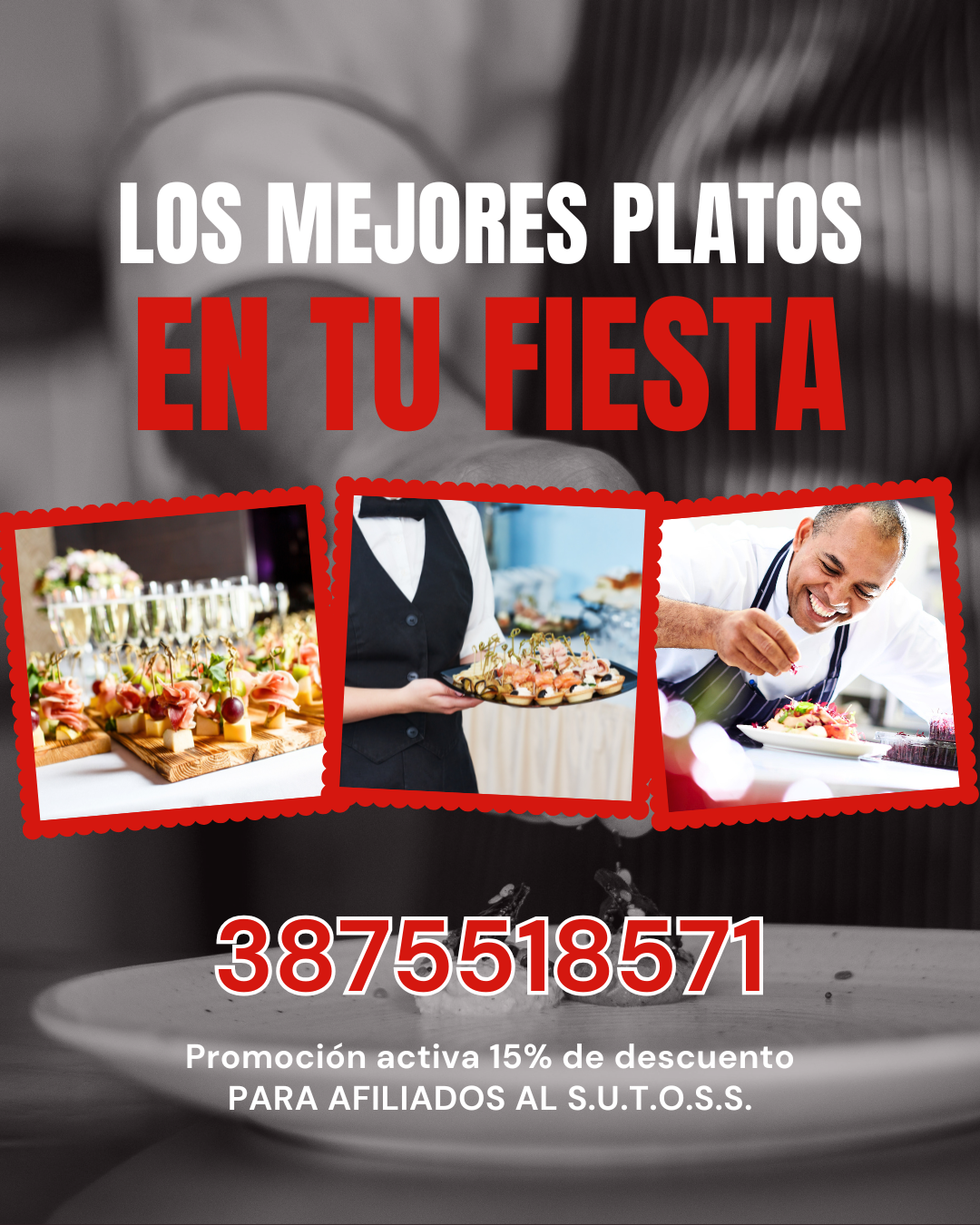 Los afiliados al S.U.T.O.S.S. tienen un 15% de descuento contratando éste servicio, ya sea para cenas familiares, quince años, cumpleaños, bodas, etc.-