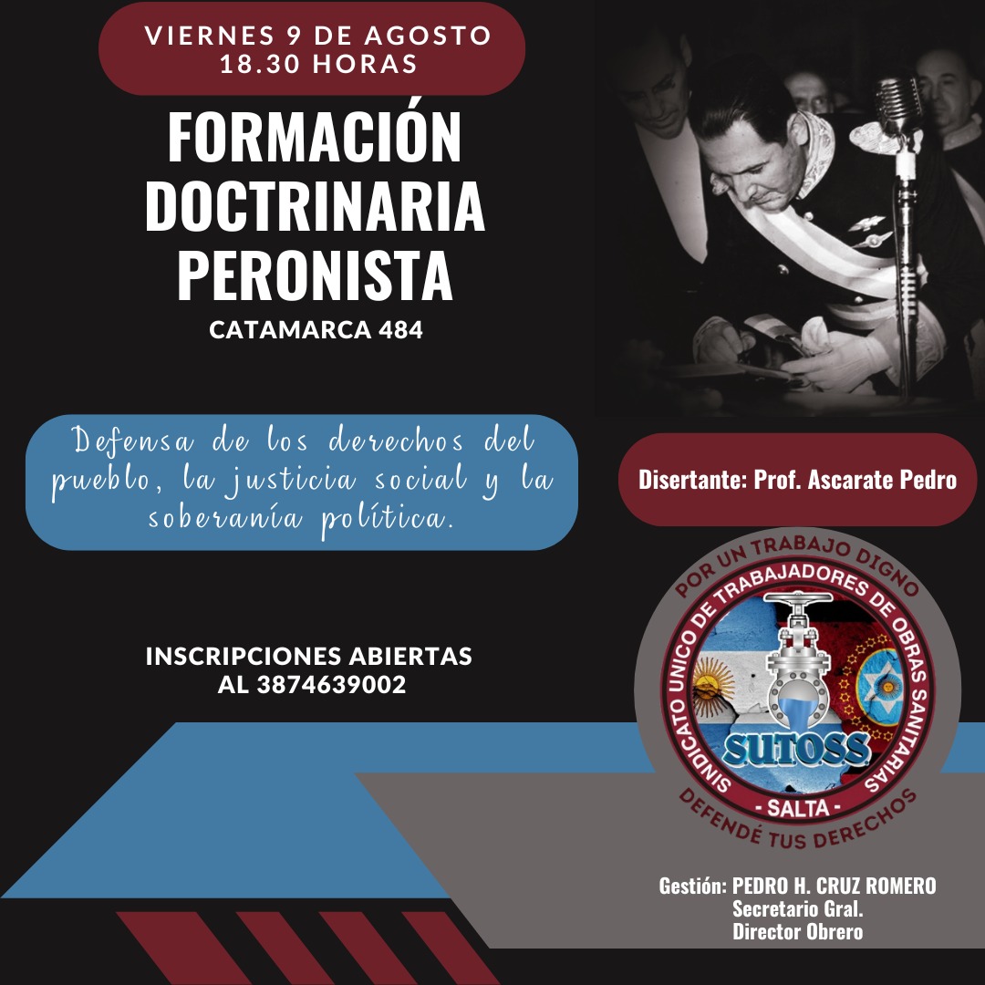 El SINDICATO ÚNICO DE TRABAJADORES DE OBRAS SANITARIAS SALTA, invita a todos los compañeros y compañeras interesados a participar de la disertación del Profesor Pedro Ascarate, quien está recorriendo distintos Sindicatos con charlas sobre la FORMACIÓN DOCTRINARIA PERONISTA.