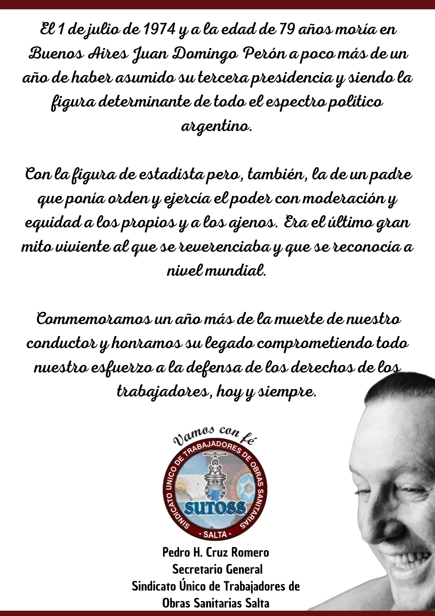 Con la figura de estadista, pero también la de un padre que ponía orden y ejercía el poder con moderación y equidad a los propios y a los ajenos. Era el último gran mito viviente al que se reverenciaba y que se reconocía a nivel mundial, por eso conmemoramos un año más del paso a la inmortalidad de nuestro conductor y honramos su legado comprometiendo todo nuestro esfuerzo en la defensa de los derechos adquiridos y por lograr de los trabajadores, hoy y siempre.