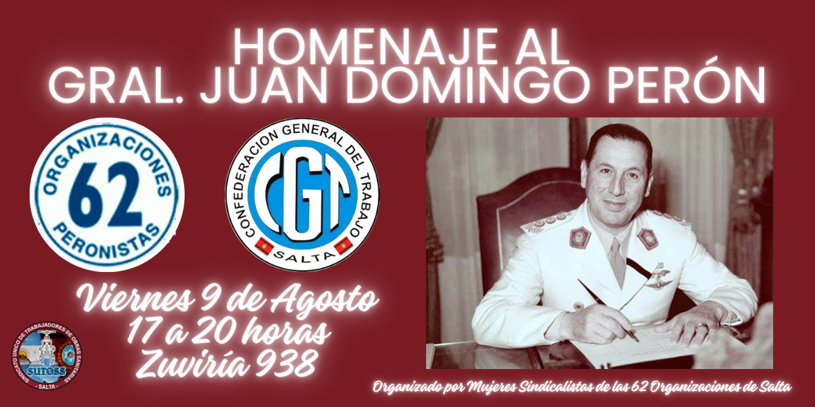 Mujeres Sindicalistas de las 62 Organizaciones Peronistas de Salta, invitan al encuentro organizado para homenajear los 50 años del fallecimiento del General Juan Domingo Perón; el mismo se realizará el día Viernes 9 de Agosto de 17 a 20 horas en la sede del Partido Justicialista, ubicada en calle Zuviría Nº 938.