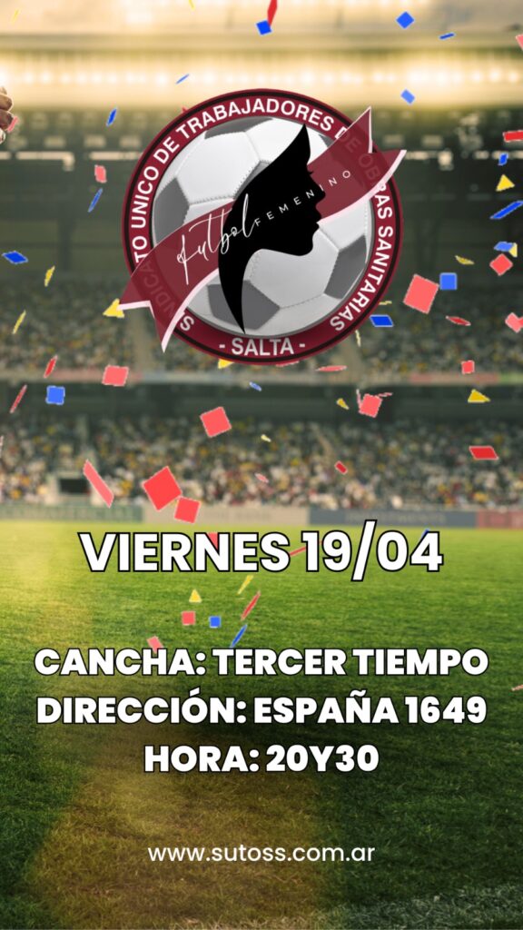 Desde el SINDICATO ÚNICO DE TRABAJADORES DE OBRAS SANITARIAS SALTA se invita a todas las compañeras a participar del Torneo 15 de Mayo de FÚTBOL FEMENINO. El mismo se realizará el día Viernes 19 del corriente mes, a partir de las 20.30 horas, en la cancha TERCER TIEMPO, ubicada en la calle España Nº 1649.