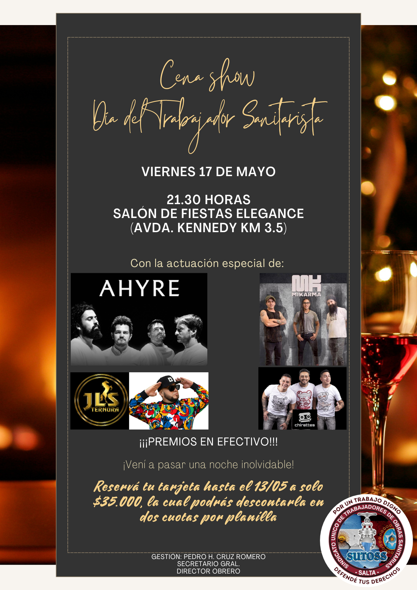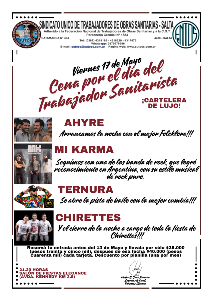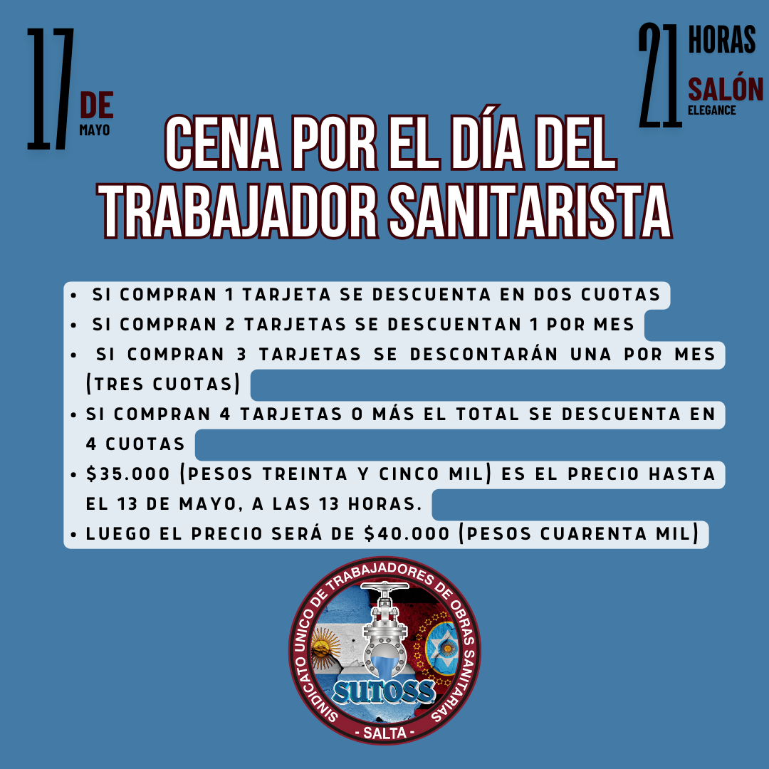 El SINDICATO ÚNICO DE TRABAJADORES DE OBRAS SANITARIAS SALTA, invita a todos sus afiliados y afiliadas a pasar una noche increíble el viernes 17 de Mayo en Salón Elegance, donde festejaremos nuestro día como TRABAJADORES SANITARISTAS!