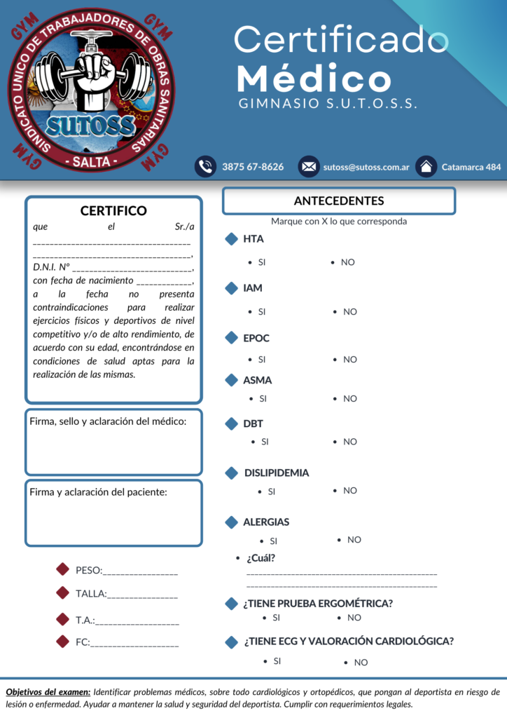 NO SE OLVIDEN!!!! ES OBLIGATORIA LA APTITUD FÍSICA Y EL ELECTROCARDIOGRAMA, por eso aquí les dejamos un modelo de certificado: