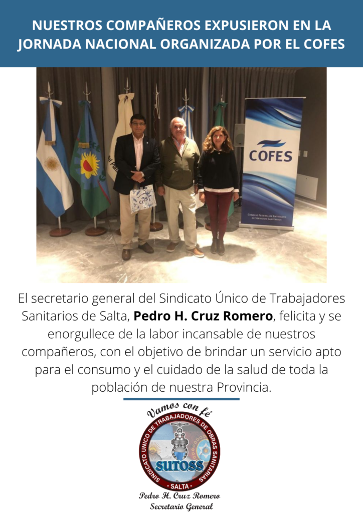 El secretario general del Sindicato Único de Trabajadores Sanitarios de Salta, Pedro H. Cruz Romero, felicita y se enorgullece de la labor incansable de nuestros compañeros, llevada adelante con el objetivo de brindar un servicio apto para el consumo y el cuidado de la salud de toda la población de nuestra Provincia.