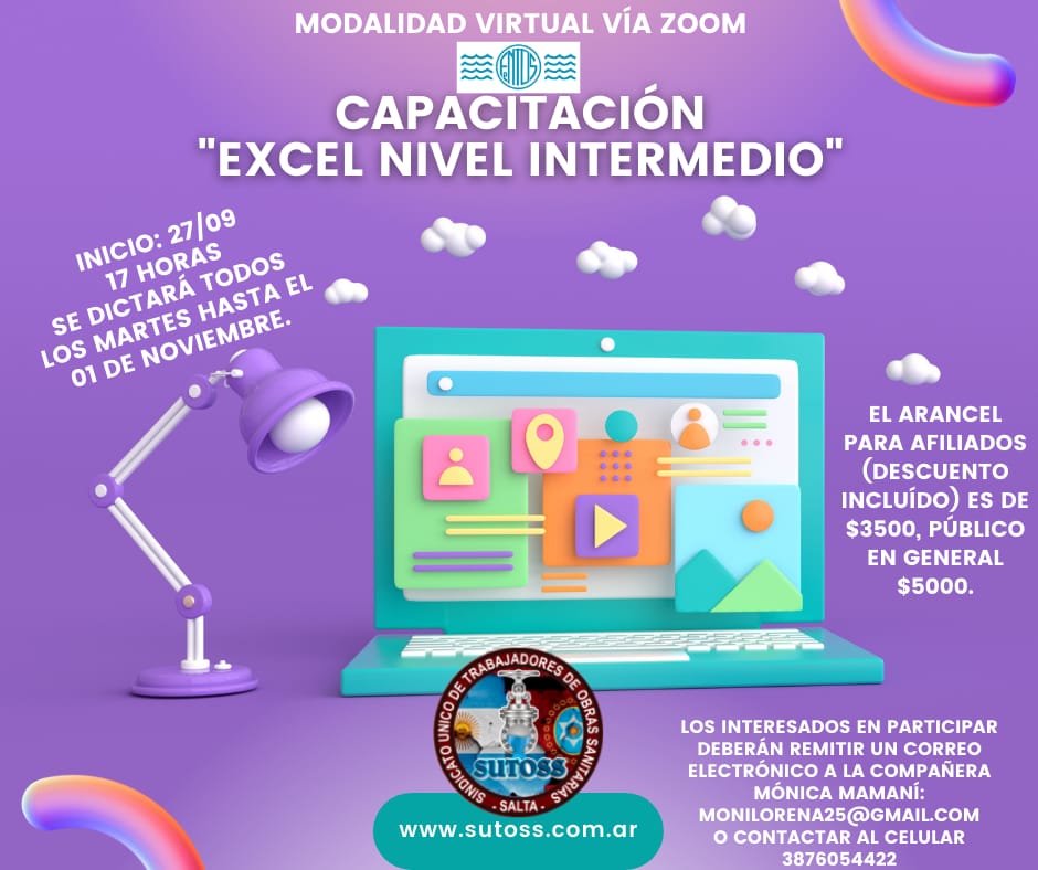 Nuestro Secretario General Pedro H Cruz Romero invita a una nueva capacitación sobre «Excel Nivel INTERMEDIO», ofrecida por la FENTOS. El curso cuenta con seis clases sincrónicas (de modalidad virtual vía Zoom). Iniciará el día 27/09 a las 17 horas, y se dictará todos los martes hasta el 1 de noviembre de 2022. El arancel para afiliados (descuento incluído) es de $3500, público en general $5000.
