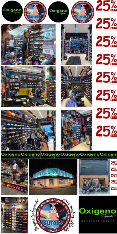 Nuestro SUTOSS te acerca un nuevo beneficio en indumentaria y accesorios deportivos: la Tienda OXÍGENO DEPORTES ofrece a nuestros afiliados un 25% de descuento en: