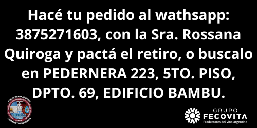 Podrás hacer tu pedido a través de la Sra. Rossana Quiroga, al wathsapp corporativo: 3875 27-1603. Los afiliados podrán retirar su compra de Lunes a sábados, de 9 a 15 horas en Pedernera Nº 223, quinto piso, departamento 69, del Ed. Bambú, y/o dependiendo de la cantidad de los productos solicitados, podrán acordar envíos a domicilio.