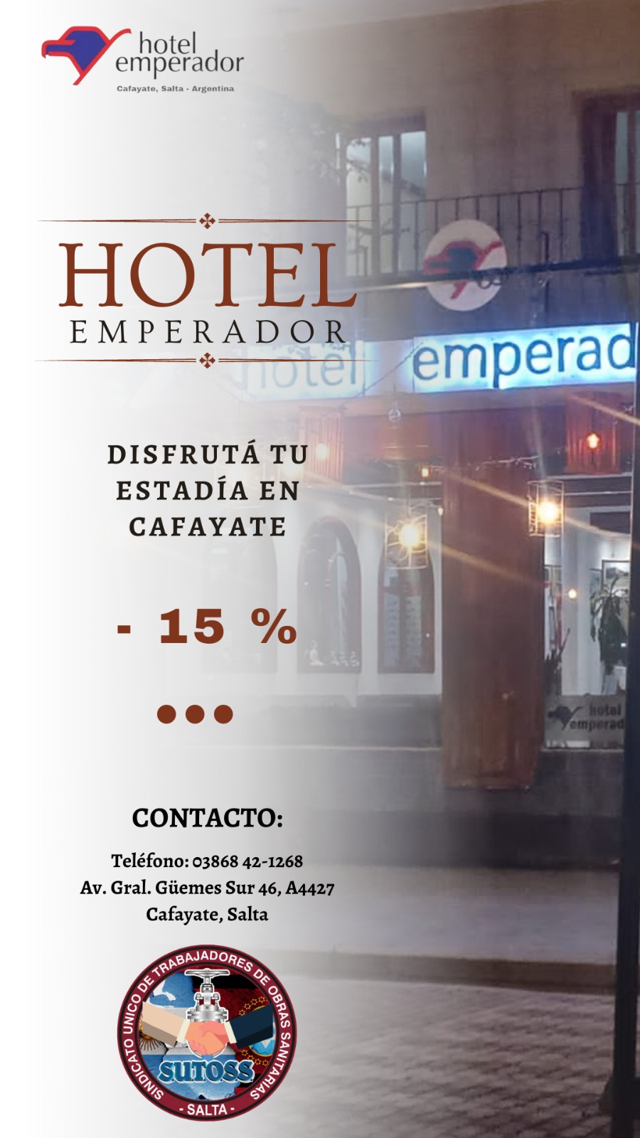 Nuestro SUTOSS te sigue acercando beneficios para tus vacaciones o estadía durante todo el año.En esta oportunidad se suma el Hotel Emperador en Cafayate, que ofrece a nuestros afiliados 10% de descuento abonando con tarjeta de crédito y 15% con pago de contado o mediante transferencia.Este hotel está ubicado en Gral. Güemes Sur 46. Por consultas de precios e informes, su teléfono es 03868- 421268.Agradecemos esta importante colaboración que permitirá a muchos afiliados disfrutar de una placentera estadía en Cafayate a precios accesibles.