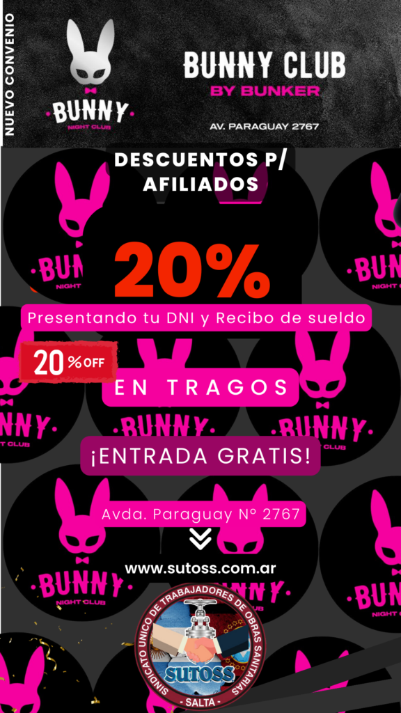 - BUNNY CLUB UBICADO EN AV PARAGUAY 2767: 20% de descuento en TRAGOS e ingreso al boliche sin costo. Encontralos en Instagram a través de este enlace: https://www.instagram.com/bunnynightclub/
