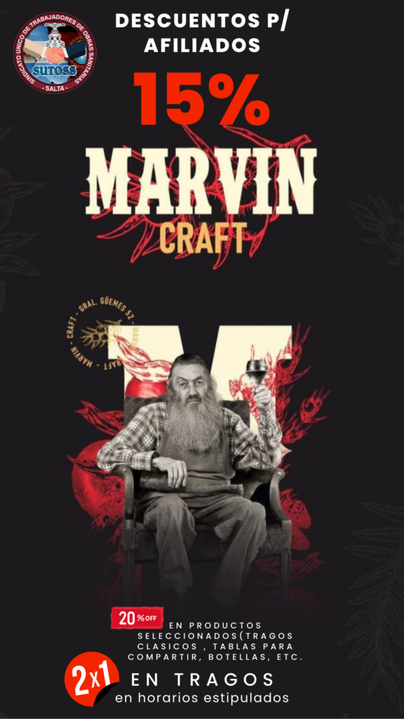 - MARVIN CRAFF UBICADO EN GRAL GUEMES 54: 15% de descuento en todo el SERVICIO DE GASTRONOMIA (VARIEDAD DE TABLAS-CARTA DE AUTOR-SUSHI-PIZZAS-TRAGOS), 2X1 EN TRAGOS. (en horarios establecidos), 20% de descuento en productos seleccionados (Tragos Clásicos, tablas para compartir, botellas, y todas las reservas sin necesidad de q pagar la seña. Encontralos en Instagram a través de este enlace: https://www.instagram.com/marvin.craft.ok/