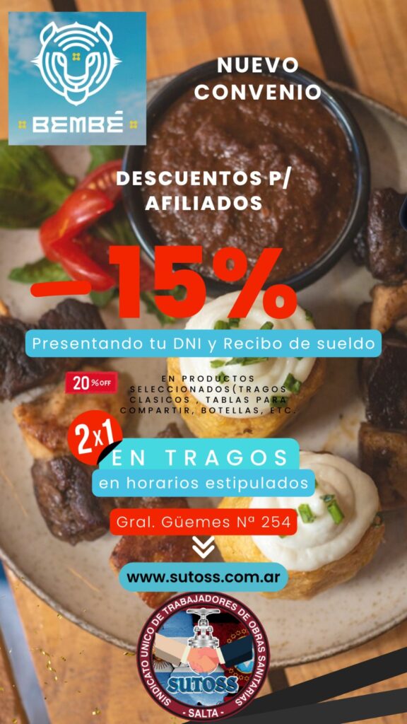 - BEMBE UBICADO EN GRAL GUEMES 254: 15% de descuento en todo el SERVICIO DE GASTRONOMIA (VARIEDAD DE TABLAS-CARTA DE AUTOR-SUSHI-PIZZAS-TRAGOS), 2X1 EN TRAGOS. (en horarios establecidos), 20% de descuento en productos seleccionados (Tragos Clásicos, tablas para compartir, botellas, y todas las reservas sin necesidad de q pagar la seña, además de un 30% de descuento en AGASAJOS Y PROMOCIONES PARA CUMPLEAÑOS en horarios matutinos. Encontralos en Instagram a través de este enlace: https://www.instagram.com/bembe.salta/