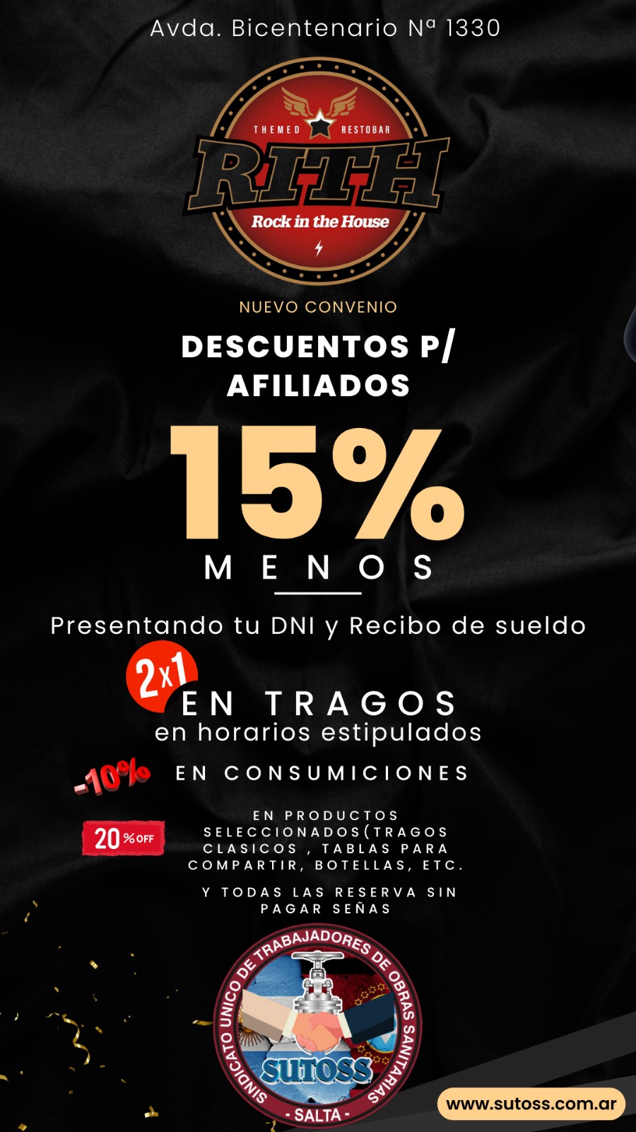 - RITH UBICADO EN AV BICENTENARIO 1330: 15% de descuento en todo el SERVICIO DE GASTRONOMIA (VARIEDAD DE TABLAS-CARTA DE AUTOR-SUSHI-PIZZAS-TRAGOS), 2X1 EN TRAGOS. (en horarios establecidos), 20% de descuento en productos seleccionados (Tragos Clásicos, tablas para compartir, botellas, y todas las reservas sin necesidad de q pagar la seña. Encontralos en Instagram a través de este enlace: https://www.instagram.com/rith_bar/