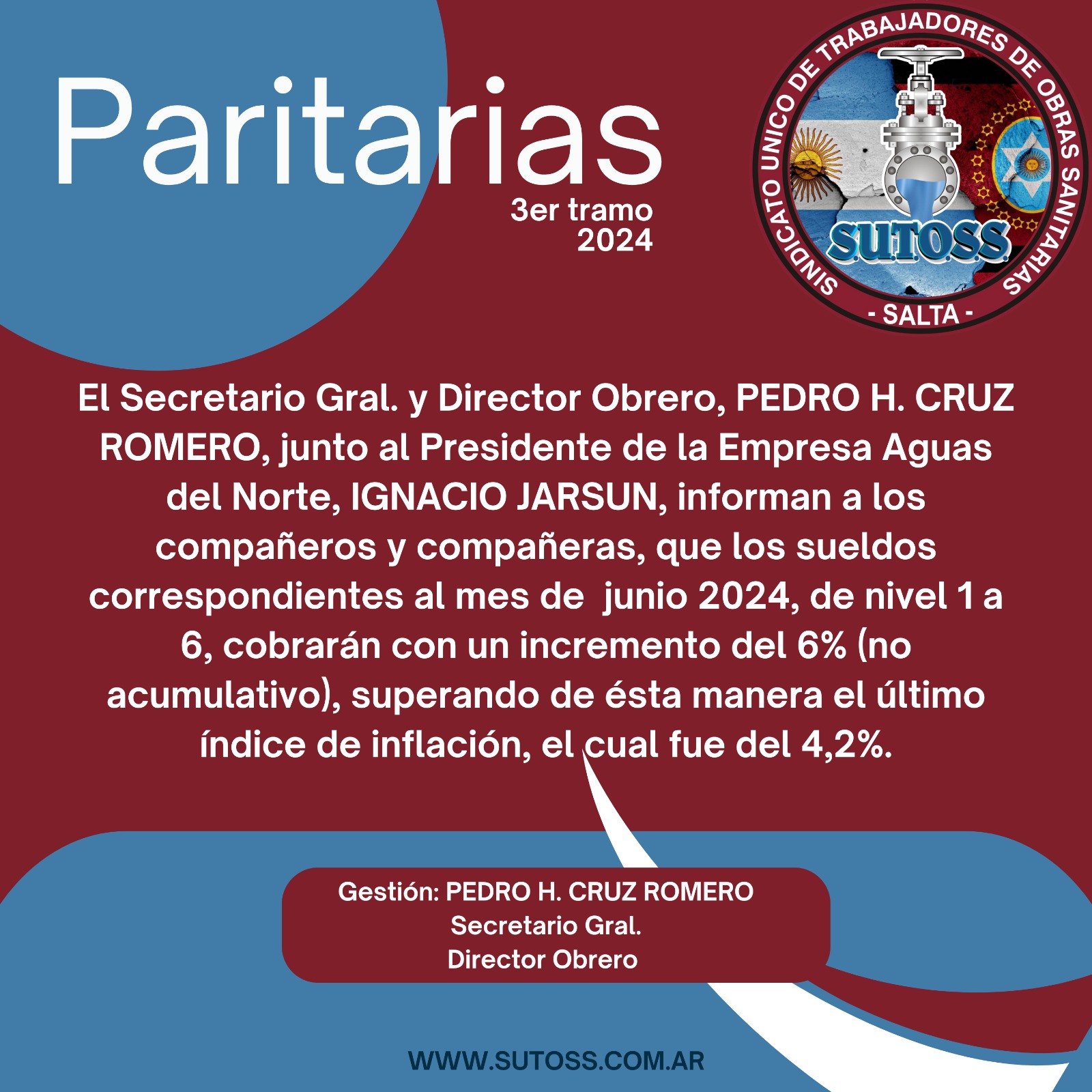 El Secretario Gral. y Director Obrero, PEDRO H. CRUZ ROMERO, informa a los compañeros y compañeras, que finalmente se consiguió de manera conjunta con el Presidente de la Empresa Aguas del Norte, IGNACIO JARSUN, que los sueldos correspondientes al mes de junio 2024, de nivel 1 a 6, cobrarán con un incremento del 6%, superando de ésta manera el último índice de inflación, el cual fue del 4,2%.