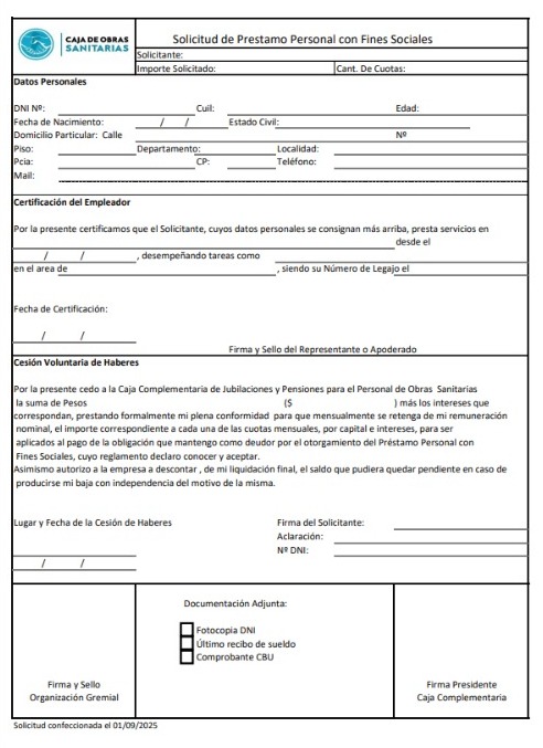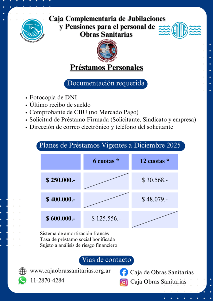 Desde el SINDICATO ÚNICO DE TRABAJADORES DE OBRAS SANITARIAS SALTA, recordamos que la Caja Complementaria, a través de los Sindicatos Intervinientes, otorga préstamos con fines sociales a los/as agentes activos/as de las empresas adheridas. Las cuotas son descontadas o retenidas de los sueldos en forma mensual por la empresa con la que presta servicios el/la solicitante.