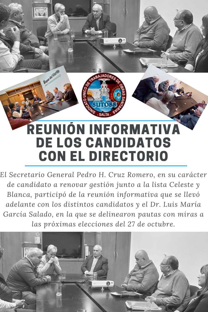 La reunión contó con la participación del director de la Compañía Salteña de Agua y Saneamiento, Dr. Luis María García Salado, y los candidatos de las tres listas participantes de los próximos comicios. En la misma se establecieron pautas sobre el desarrollo de la jornada electoral y se autorizó a las listas a comenzar su campaña de difusión de propuestas dentro de los diferentes sectores, predios y plantas de la empresa.