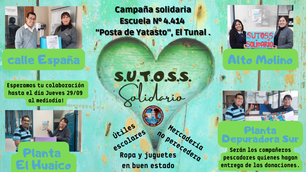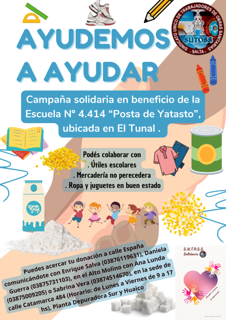 La escuela primaria N°4.414 “Posta de Yatasto” es una institución pública, perteneciente al pueblo El Tunal, Departamento de Metán. Dicha escuela tiene 104 años de vida y cuenta con 113 niños entre 5 a 12 años de nivel inicial y primaria, y brinda a los alumnos desayuno y almuerzo de lunes a viernes.Podés acercar tu aporte a calle España 887, comunicándote con Enrique Salva (03876119631), Daniela Guerra (03875731103), en el Alto Molino con Ana Lunda (03875009205) o Sabrina Vera (03874514670), o bien en la sede de calle Catamarca 484 de 9 a 17 hs. También se reciben donaciones en Planta Depuradora Sur y Cisterna Huaico ¡Desde ya muchas gracias por sumarte a la propuesta e iniciativa!