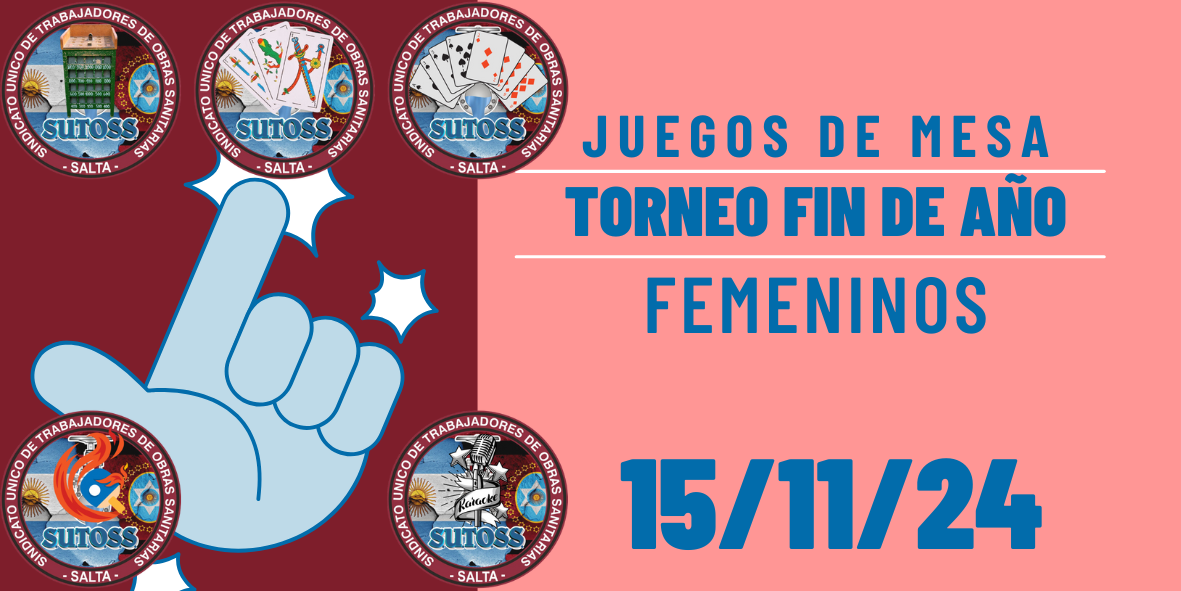 El SINDICATO ÚNICO DE TRABAJADORES DE OBRAS SANITARIAS SALTA se complace en invitar a todas las compañeras al último torneo del 2024 de juegos de mesa: PING PONG, LOBA, TRUCO, SAPO Y KARAOKE!!!