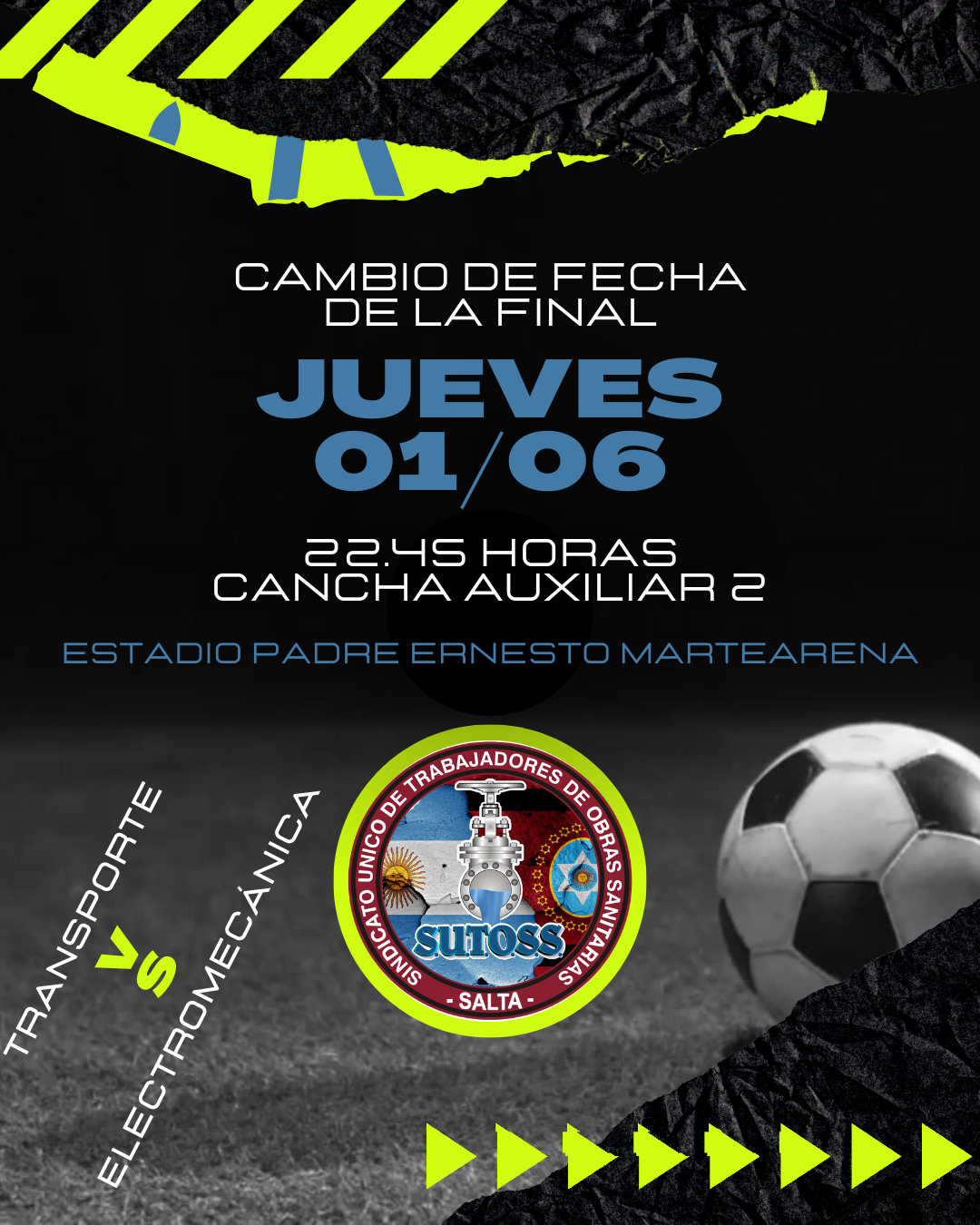 Se informa a todos los compañeros que participan del TORNEO DE FÚTBOL MASCULINO POR EL DÍA DEL PADRE que el día Viernes 02 de Junio juega Juventud Antoniana por el Federal A de local, por tal motivo la Final de Fútbol se jugará el Jueves 01 de Junio a las 22.45 horas en la cancha auxiliar N° 2 en el Estadio Padre Ernesto Martearena.