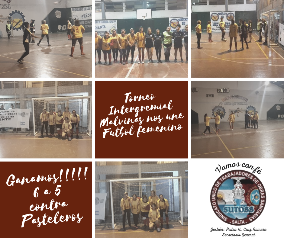 Con una victoria de 6 a 5 en un vibrante encuentro, el equipo femenino de fútbol de nuestro SUTOSS derrotó al Sindicato de Pasteleros, avanzando así en el torneo «Malvinas nos une».