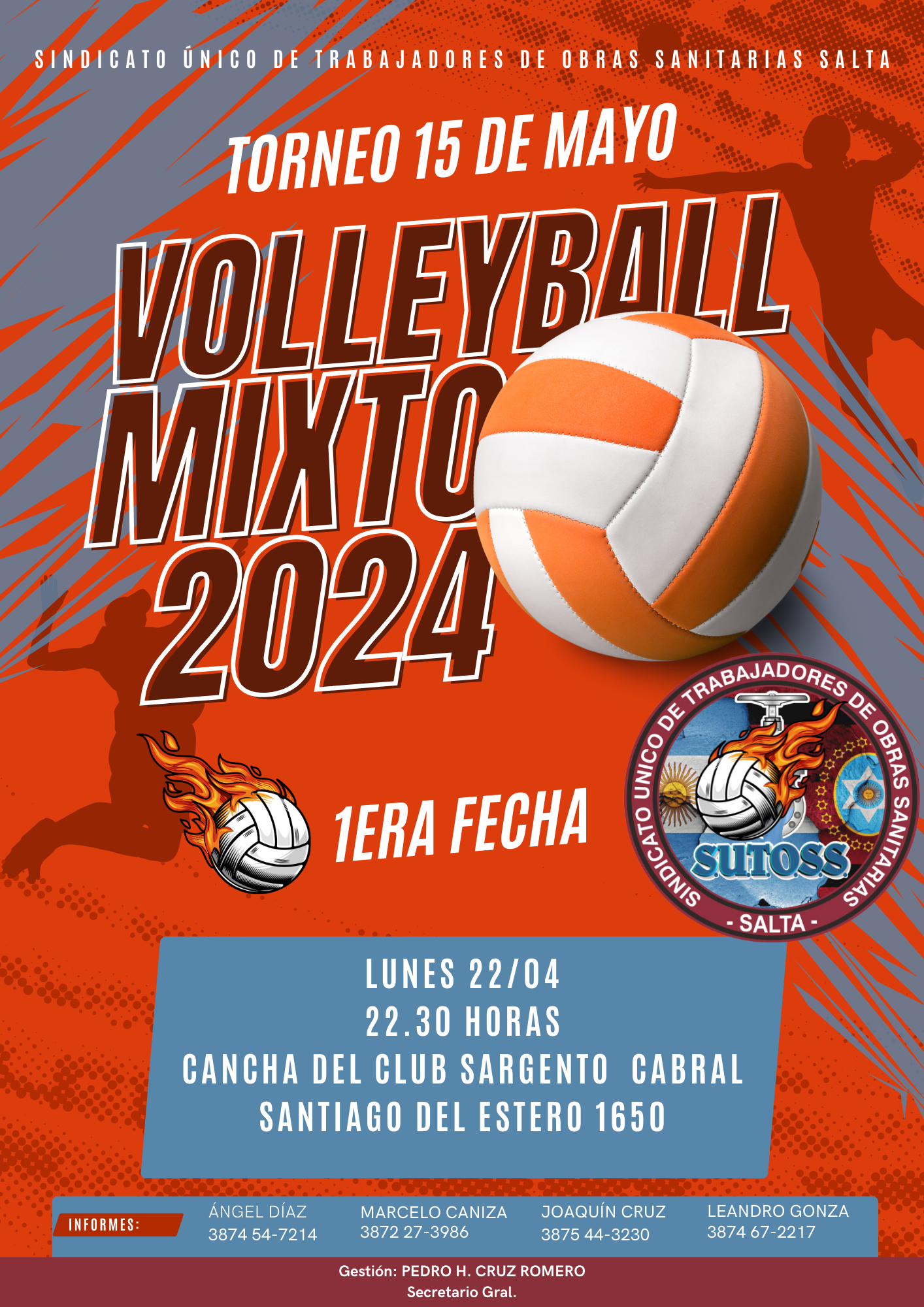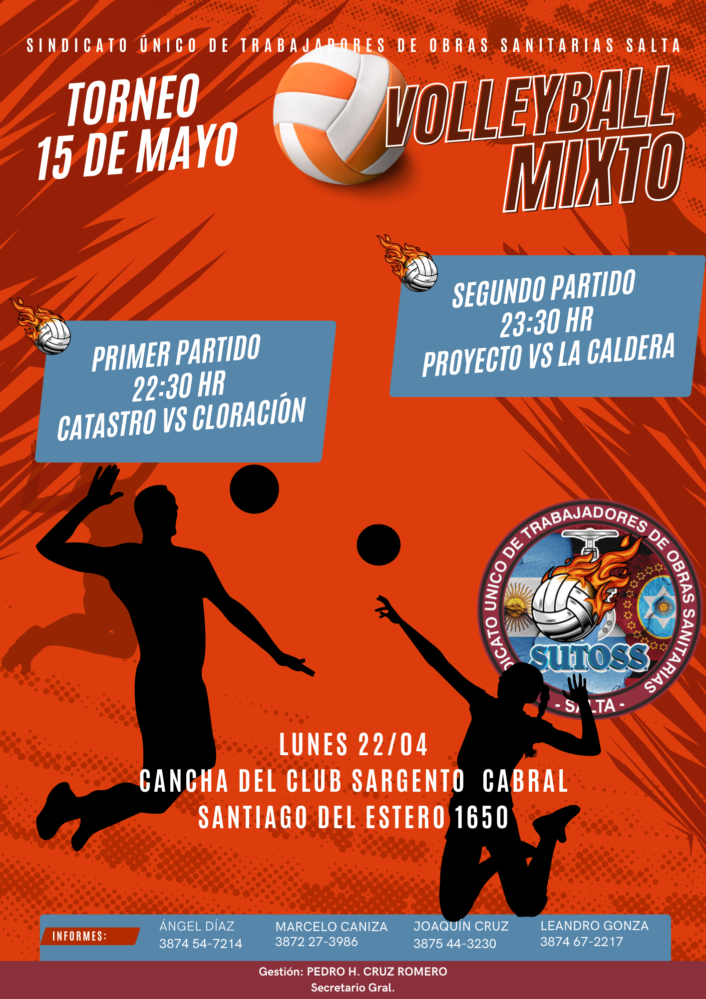 Desde el SINDICATO ÙNICO DE TRABAJADORES DE OBRAS SANITARIAS SALTA se informa a todos los compañeros y compañeras que el día Lunes 19 de Abril se dará inicio al TORNEO DE VOLLEY MIXTO.