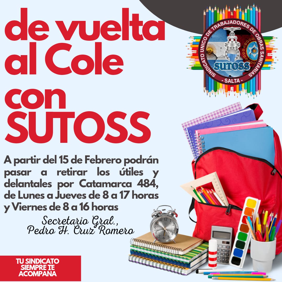 Nuestro Secretario General Pedro H Cruz Romero, informa que a partir del día miércoles 15 de Febrero, los afiliados podrán pasar a retirar los bolsones de útiles y delantales.La entrega se realizará en la sede gremial de calle Catamarca 484, de lunes a jueves de 8 a 17 horas, viernes de 8 a 16 horas.Nuestro Sindicato acompaña con sus mejores deseos el inicio de un año lectivo exitoso.