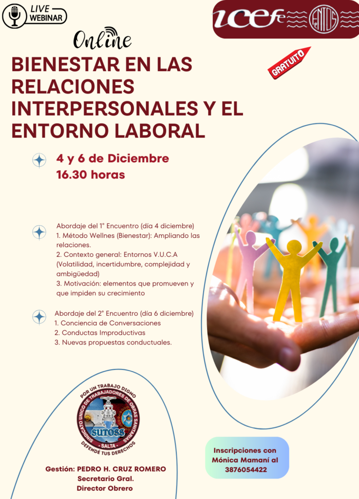 El webinario “Bienestar en las Relaciones Interpersonales y el Entorno Laboral”, se realizará los días 4 y 6 de diciembre 2023, a las 16:30 hs, a través de la plataforma zoom. Dicho encuentro es SIN ARANCEL. Estará a cargo de los licenciados Gustavo Iaccino y Claudia Cerliani, docentes que ya han trabajado con nosotros este año, en otras oportunidades.