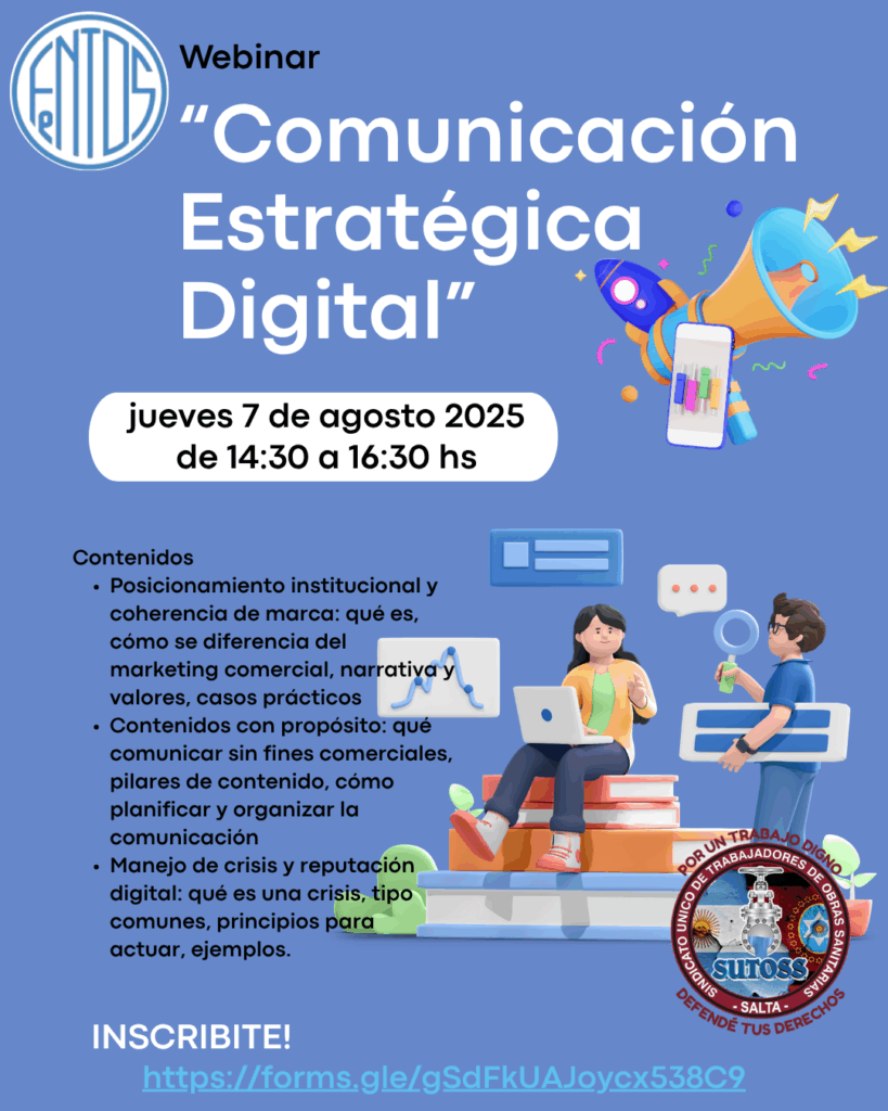 El SINDICATO ÚNICO DE TRABAJADORES DE OBRAS SANITARIAS SALTA, tiene el agrado de invitar a los Compañeros y Compañeras interesadas, o del ámbito de la comunicación, emprendedores y/o interesados en construir presencia profesional en entornos digitales, a éste nuevo Webinario de “Comunicación Estratégica Digital”, el cual tendrá lugar el día jueves 7 de agosto 2025, en el horario de 14:30 a 16:30 hs.